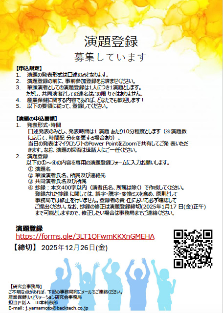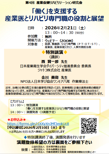 このたび産業保健リハビリテーション研究会におきまして『「働く」を支援する産業医とリハビリ専門職の役割と展望』をテーマに、2026年2月21日(土)WEB開催することとなりました(日本作業療法士協会 後援)。