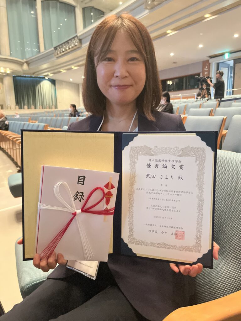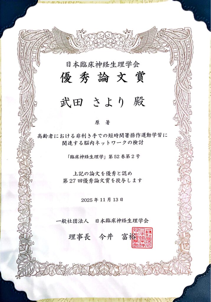 宮本研究室2024年9月修了生の武田さよりさん(国立障害者リハビリテーションセンター研究所 所属)の博士論文が、第27回日本臨床神経生理学会優秀論文賞を受賞しました。